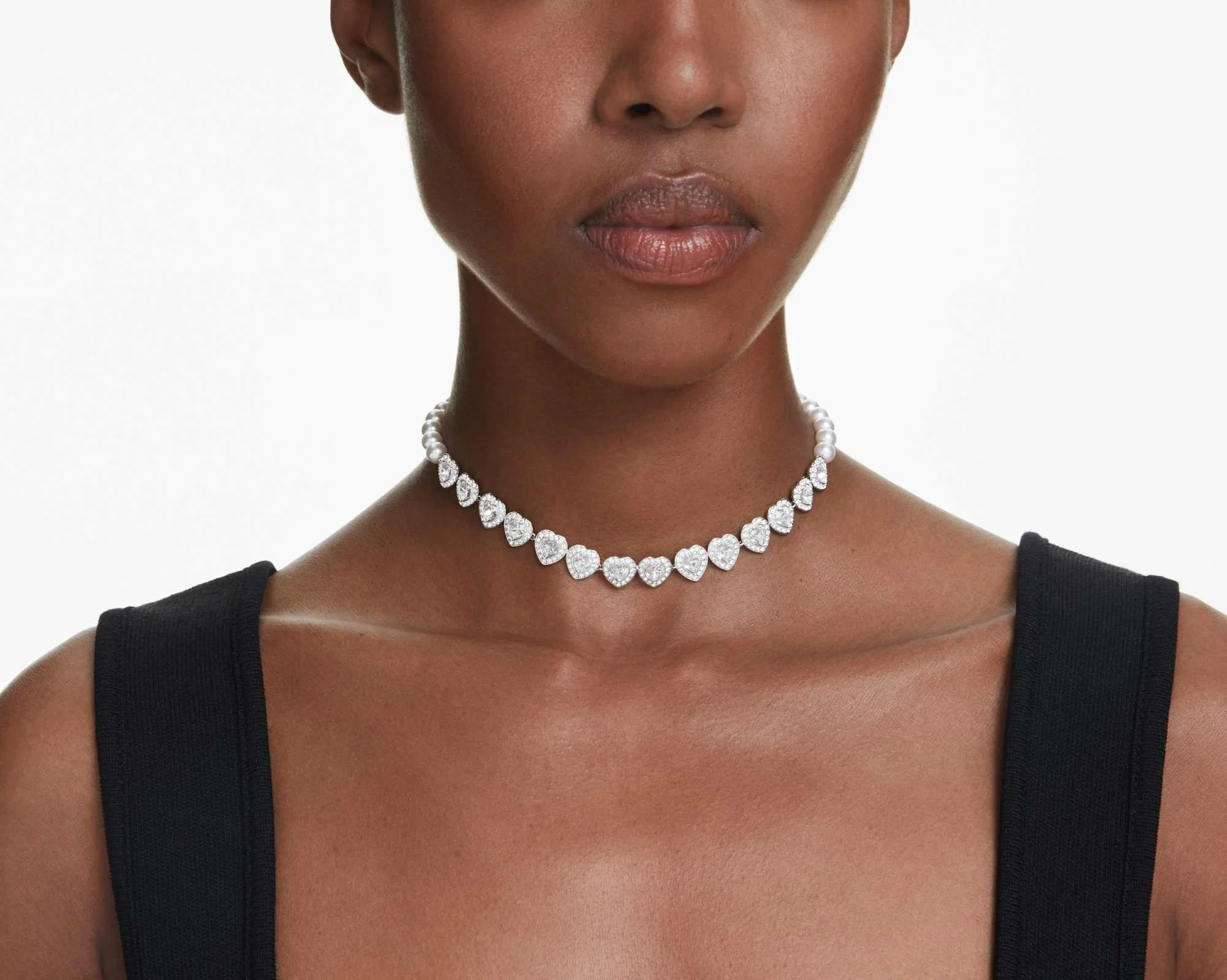 Dieser strahlende Choker ist der Inbegriff intensiver Zuneigung. Das rhodinierte Design ist teilweise mit luxuriösen Swarovski Kristallperlen besetzt, während die Vorderseite eine Reihe von Kristallherzen ziert, die jeweils von einem hellen Strahlenkranz in klarem Pavé umgeben sind. Mit dem Zugmechanismus auf der Rückseite passt sich das Schmuckstück immer perfekt an Ihren Hals an. Kombinieren Sie diese auffallende Halskette mit anderen, perfekt dazu passenden Schmuckstücken zu Ihrem ganz eigenen romantischen Look.