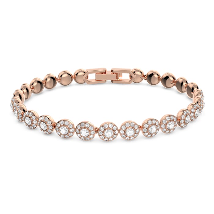 Das ist reine, zeitlos schöne Eleganz! Das Armband in rotgold glänzendem Metall funkelt mit einer Reihe runder, klarer Kristalle, jeweils umkränzt von klarem Kristallpavé, und verleiht jedem Look ein feminines Funkeln. Es passt perfekt zu allen anderen Schmuckstücken der Angelic Linie. Zusammen mit einer Uhr von Swarovski entsteht ein stylischer Tageslook. Die Kreation ist 17 cm lang.